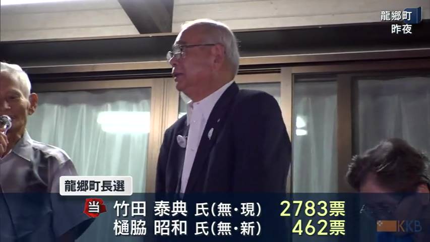 任期満了に伴う奄美大島・龍郷町の町長選挙は26日に即日開票され、現職の竹田泰典さん(73)が、新人の樋脇昭和さん(67・・・