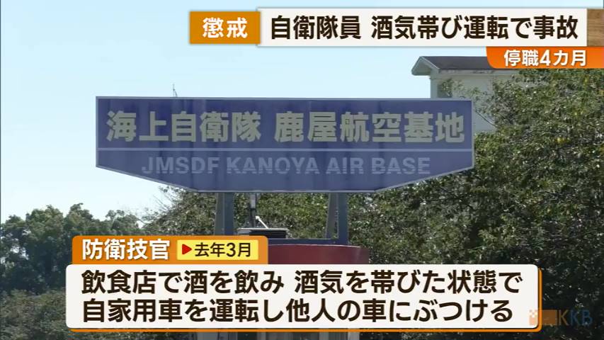 酒気を帯びた状態で車を運転し物損事故を起こしたとして、海上自衛隊鹿屋航空基地の30代の隊員が停職4カ月の懲戒処分を受けま・・・