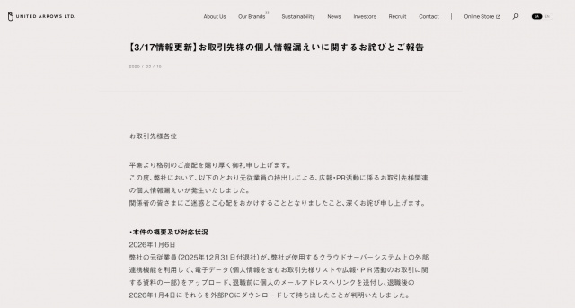 ユナイテッドアローズは、17日までに公式サイトを更新。約1万人の取引先の個人情報漏えいについて詳細を説明し、謝罪した。 発表で「元従業員の持出しによる、広報・PR活動に係るお取引先様関連の個人情報漏えいが発生いたしました」と説明。「関係者の皆さまにご・・・