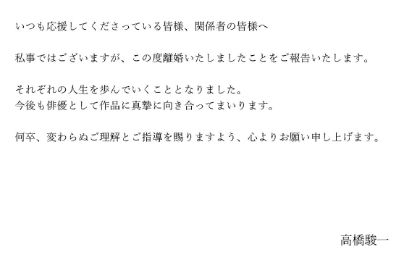 俳優の高橋駿一(37)が、11日までに自身のXを更新。離婚したことを報告した。 投稿で「応援してくださってる皆様、関係者の皆様へ」と書き出し文書を公開。文書で「いつも応援してくださっている皆様、関係者の皆様へ」とし、「私事ではございますが、この度離婚・・・