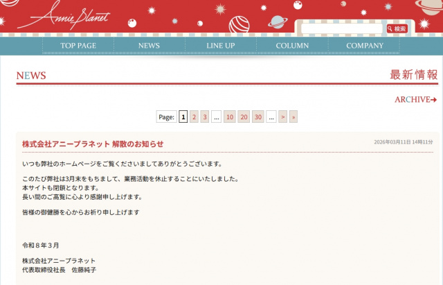 映画配給・宣伝会社のアニープラネットは11日、公式サイトを更新し、3月末で業務活動を休止し、解散することを発表した。 同社は、代表取締役・佐藤純子社長の名義で文書を掲載。「株式会社アニープラネット 解散のお知らせ」と題し、「このたび弊社は3月末をもち・・・